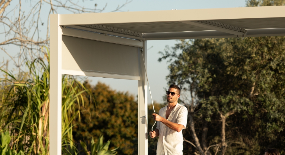 גזיבו CLIMATECH לחצר מאפשר לכם הוספת וילונות גלילה לחלק או כל דפנות הגזיבו. וילונות הגלילה מאפשרים לכם ליצור הצללה צידית מהשמש ומרחב אינטימי ושקט.