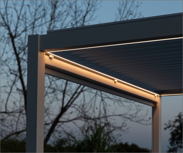 גזיבו CLIMATECH מאפשר לכם הוספה של מערכת תאורת LED עם אור איכותית. פסי התאורה חבויים בתוך תעלות ייעודיות בקורות העליונות של הגזיבו ליצירת תאורה מושלמת אשר תנעים לכם את השהייה בחוץ גם בשעות החשיכה. המערכת כולל שלט עם אפשרויות לשליטה על עוצמת האור ועל כיבוי אוטומטי.