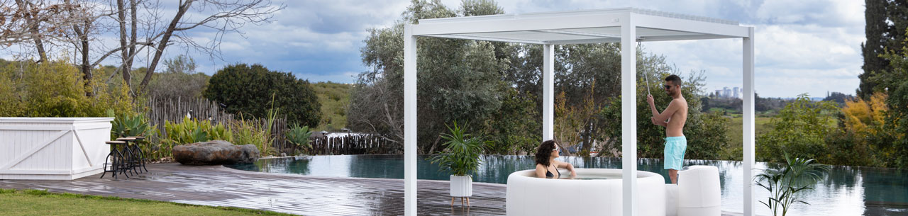 אם אתם יש לכם ג’קוזי מכל סוג – גזיבו אלומיניום דגם CLIMATECH היא הפתרון המושלם – הג’קוזי יישמר טוב יותר, השהייה בג’קוזי תהיה מהנה יותר ועדיין אתם שומרים לכם את האופציה לפתוח את הרפפות וליהנות מקרני השמש. וילונות הגלילה גם הם יוכלו לספק לכם הצללה ומרחב אינטימי.