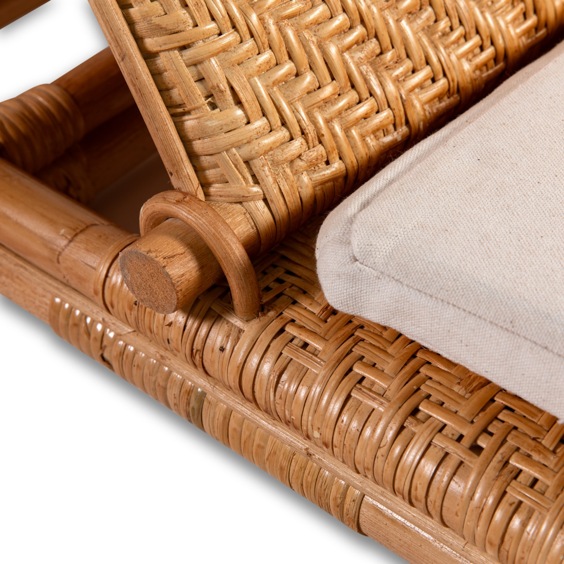 - חומרים טבעיים: עשוי ראטן אקולוגי ארוג ביד, עם מושב ומשענת קלועים בצבע טבעי ומרהיב.הכיסא כולל כרית ישיבה מפנקת מבד דמוי פשתן במראה טבעי, המוסיפה נוחות מרבית ויופי כפרי שמשתלב בהרמוניה עם עיצוב הראטן.