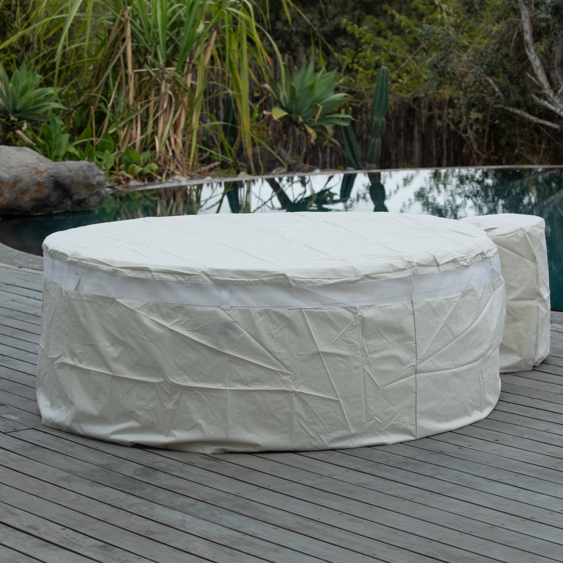 - מונע עובש – רשת טקסיליין בחלק העליון של הדופן מאפשרת לאדים להשתחרר מן במרווח הקיפול של המכסה. אוורור זה חשוב על מנת למנוע עובש במכסה ובג’קוזי עצמו (בהשוואה לכיסויים אשר אינם כוללים רשת אוורור בקו המכסה).